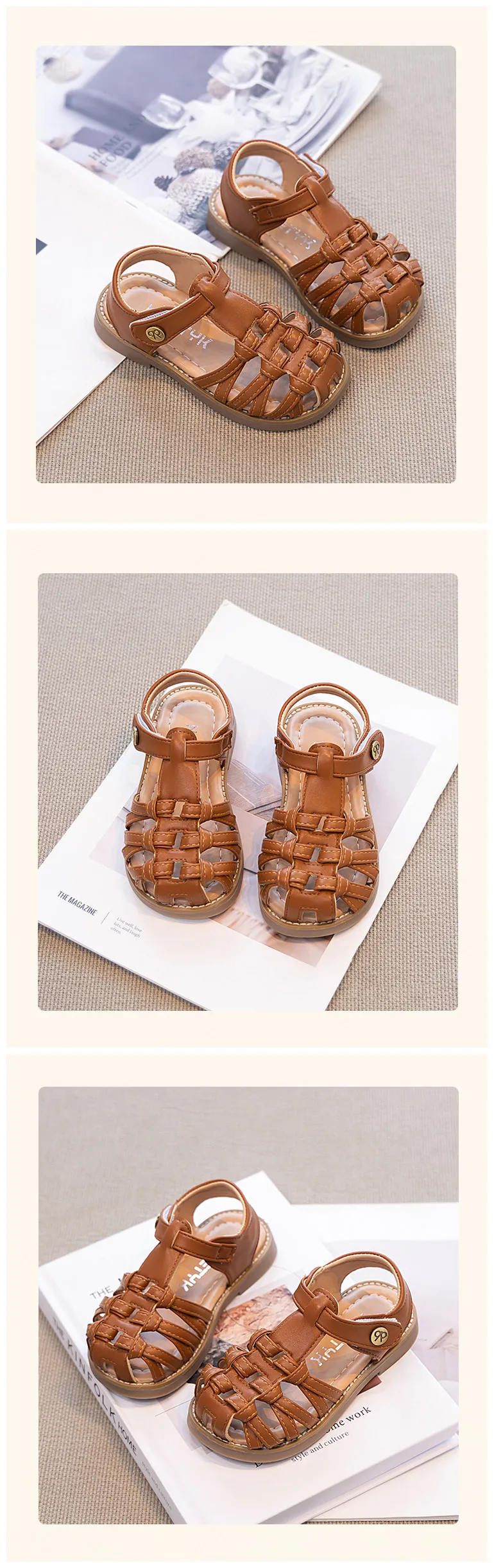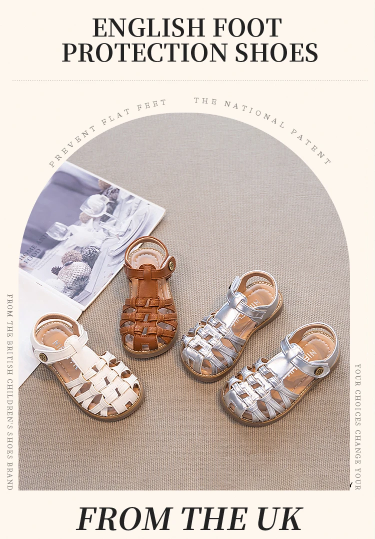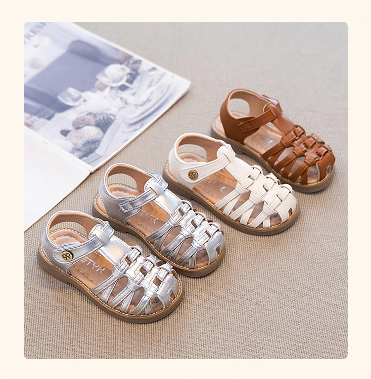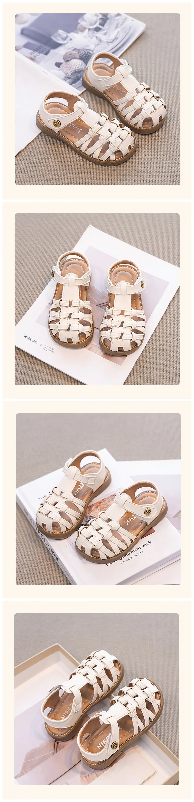 Kids Leather Cage Sandals for Girls 2025 Summer New Toddler Beach Vacation Shoes Non-slip Soft Sole Retro Garden Wedding Flats - beige / 23