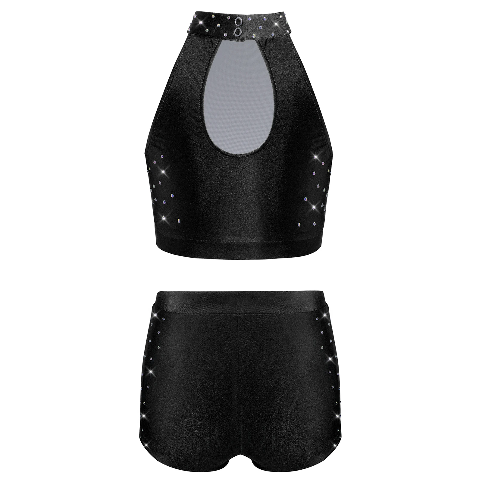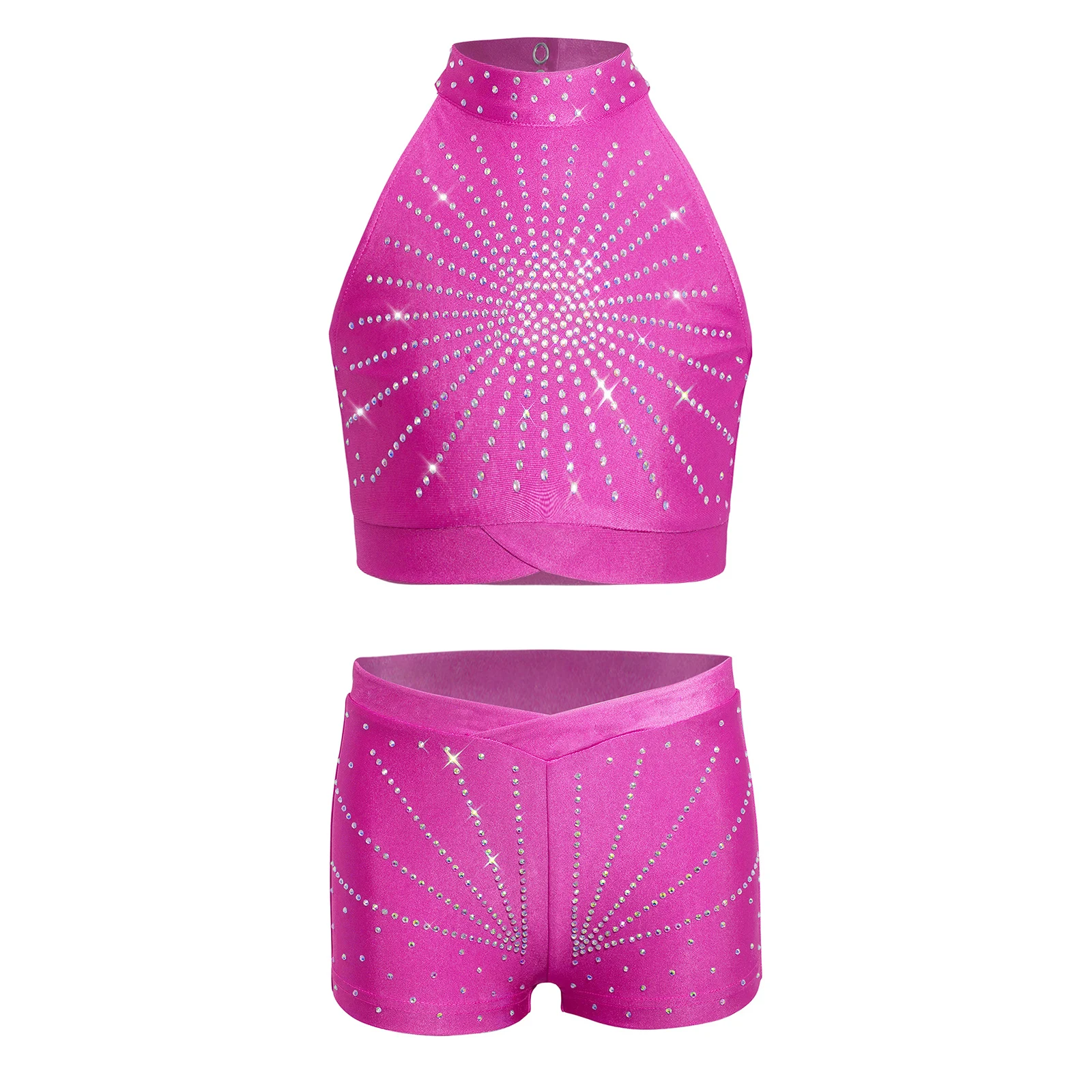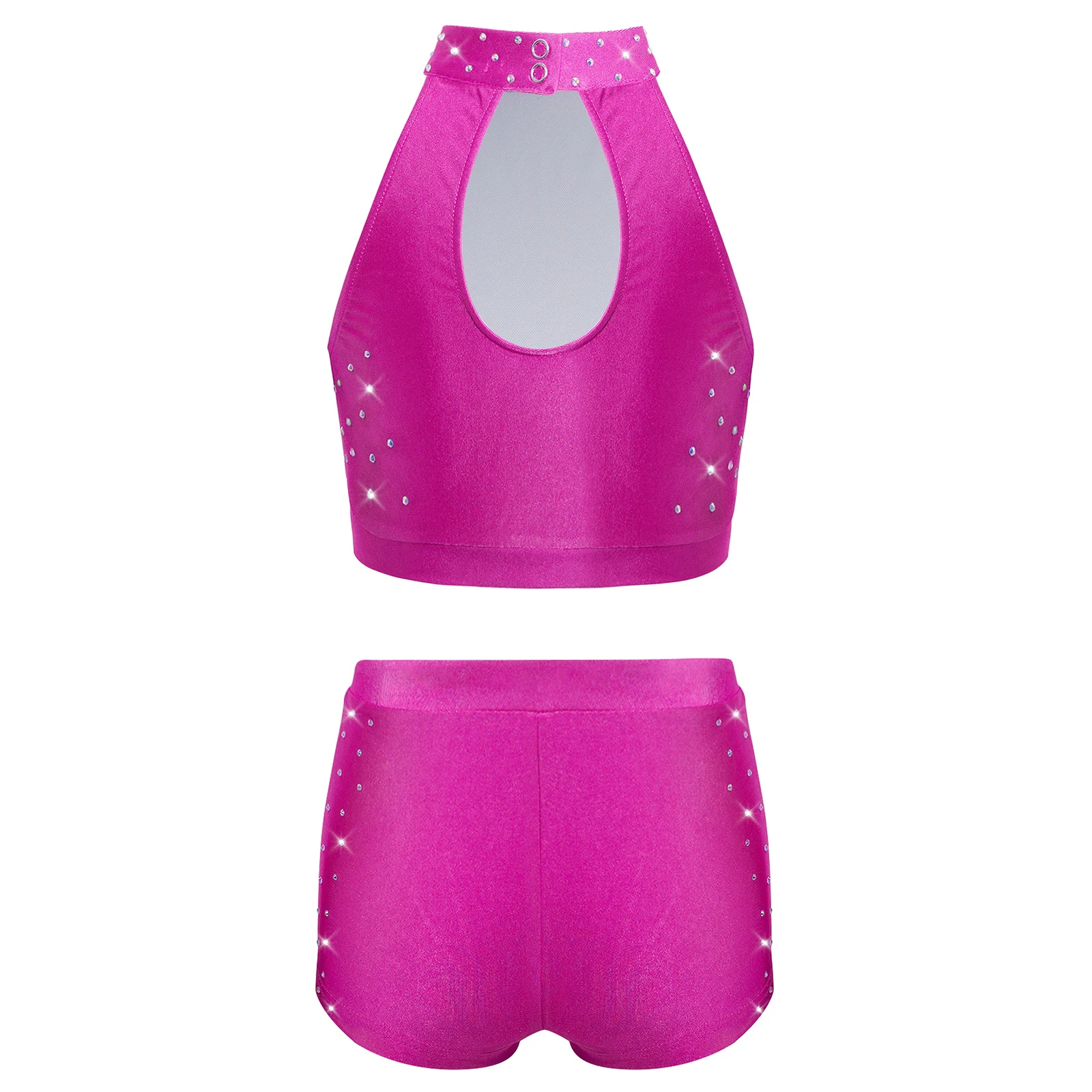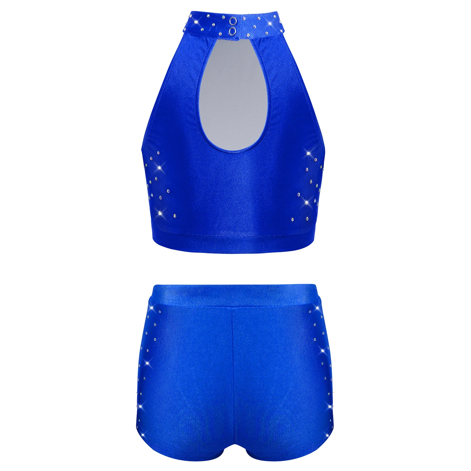Kids Girls Ballet Dance Outfits Gymnastics Performance Costume Cutout Back Sparkling Rhinestone Crop Top with V-front Shorts - Royal Blue / 6
