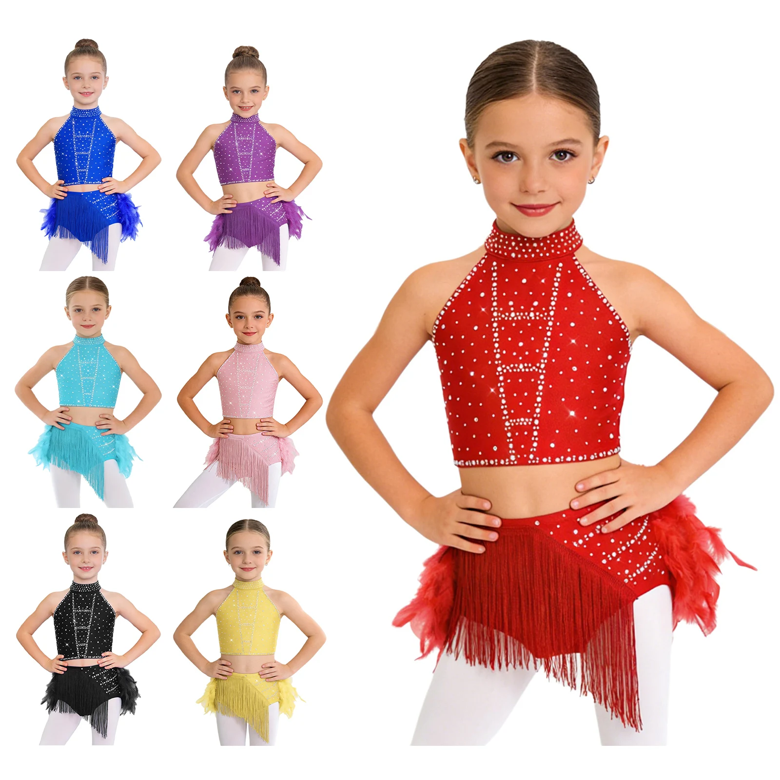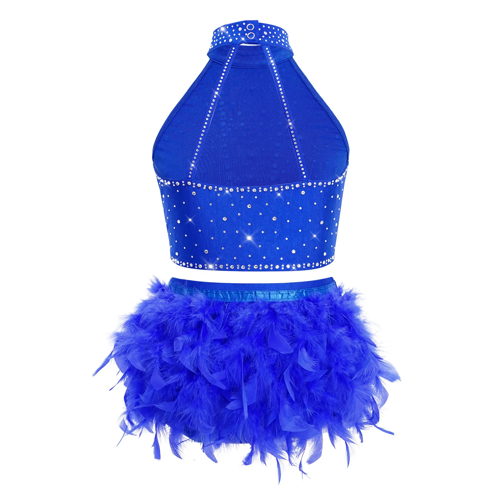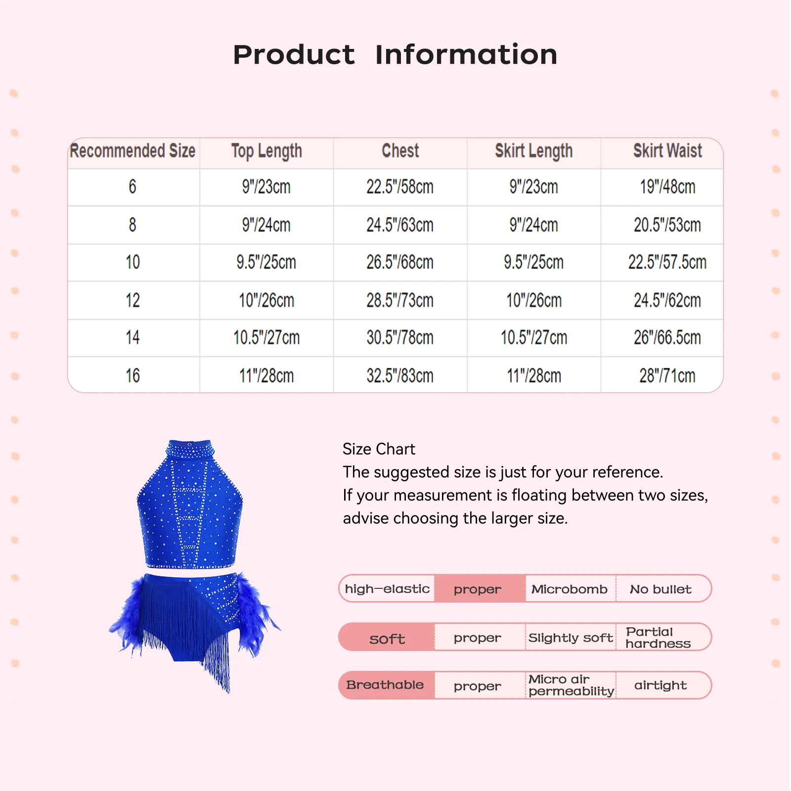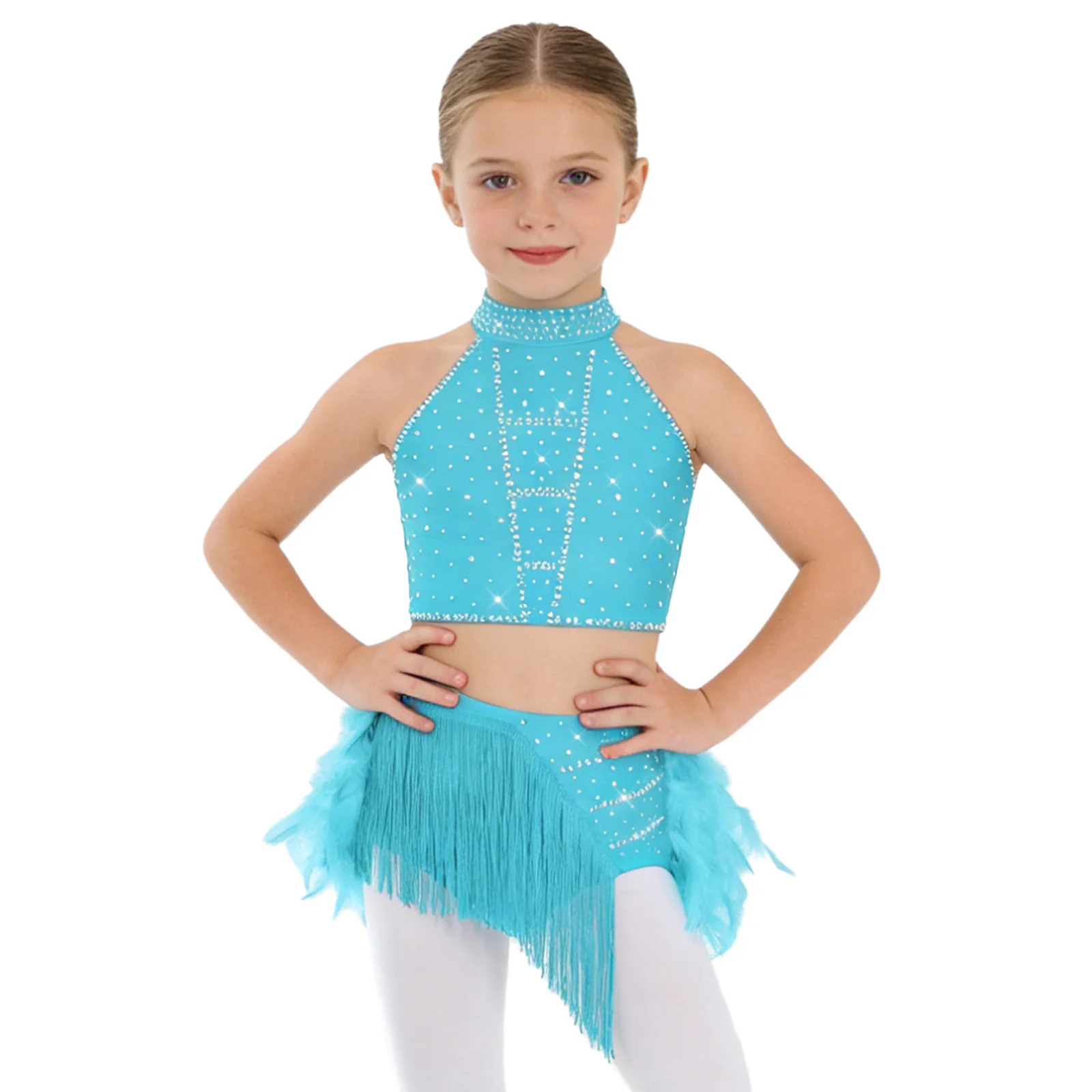 Kids Girls Ballet Samba Rumba Dance Outfits Latin Dance Performance Costume Crop Top with Tassels Feather Skirt Dance Wear - Royal Blue / 6