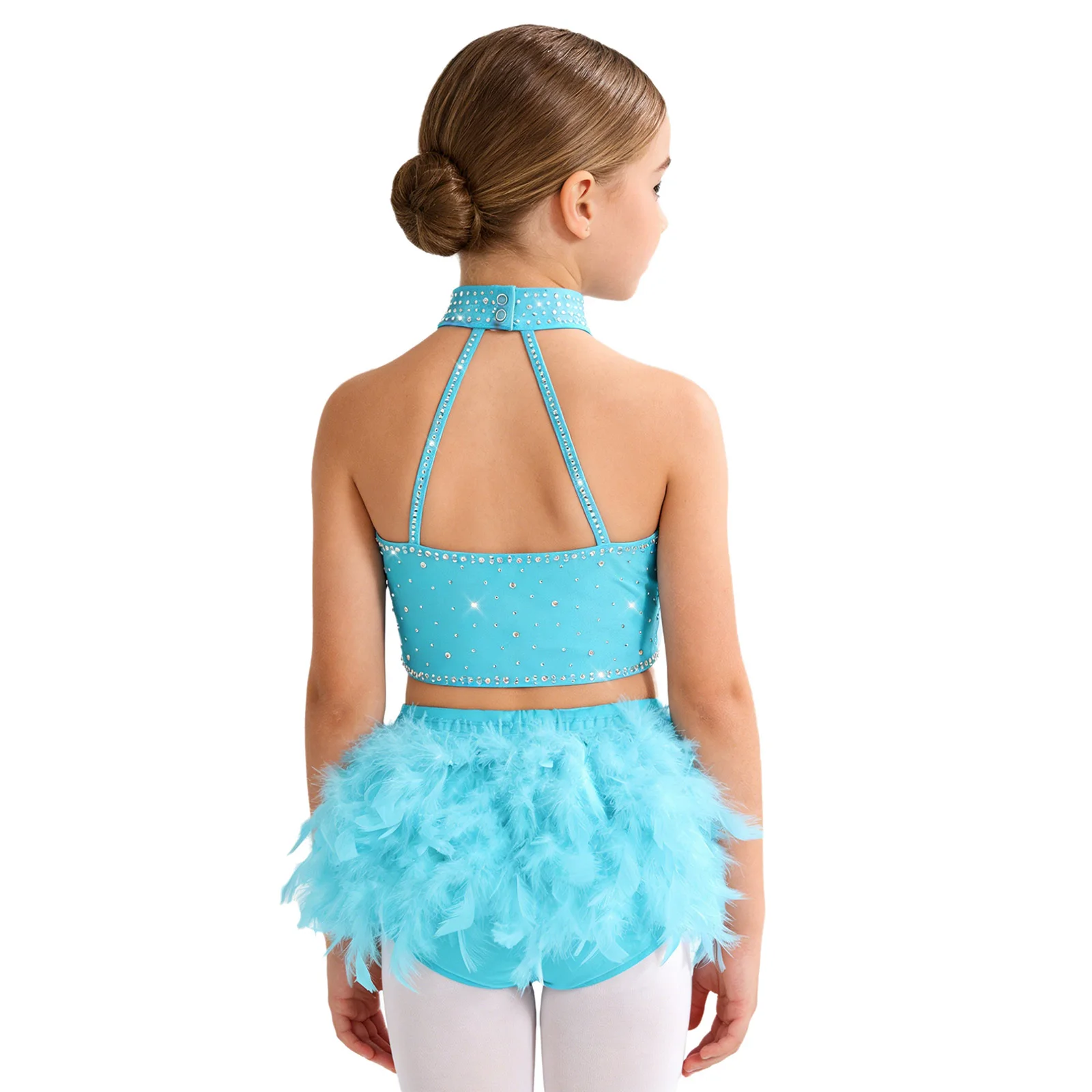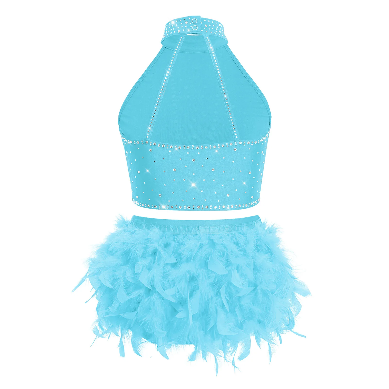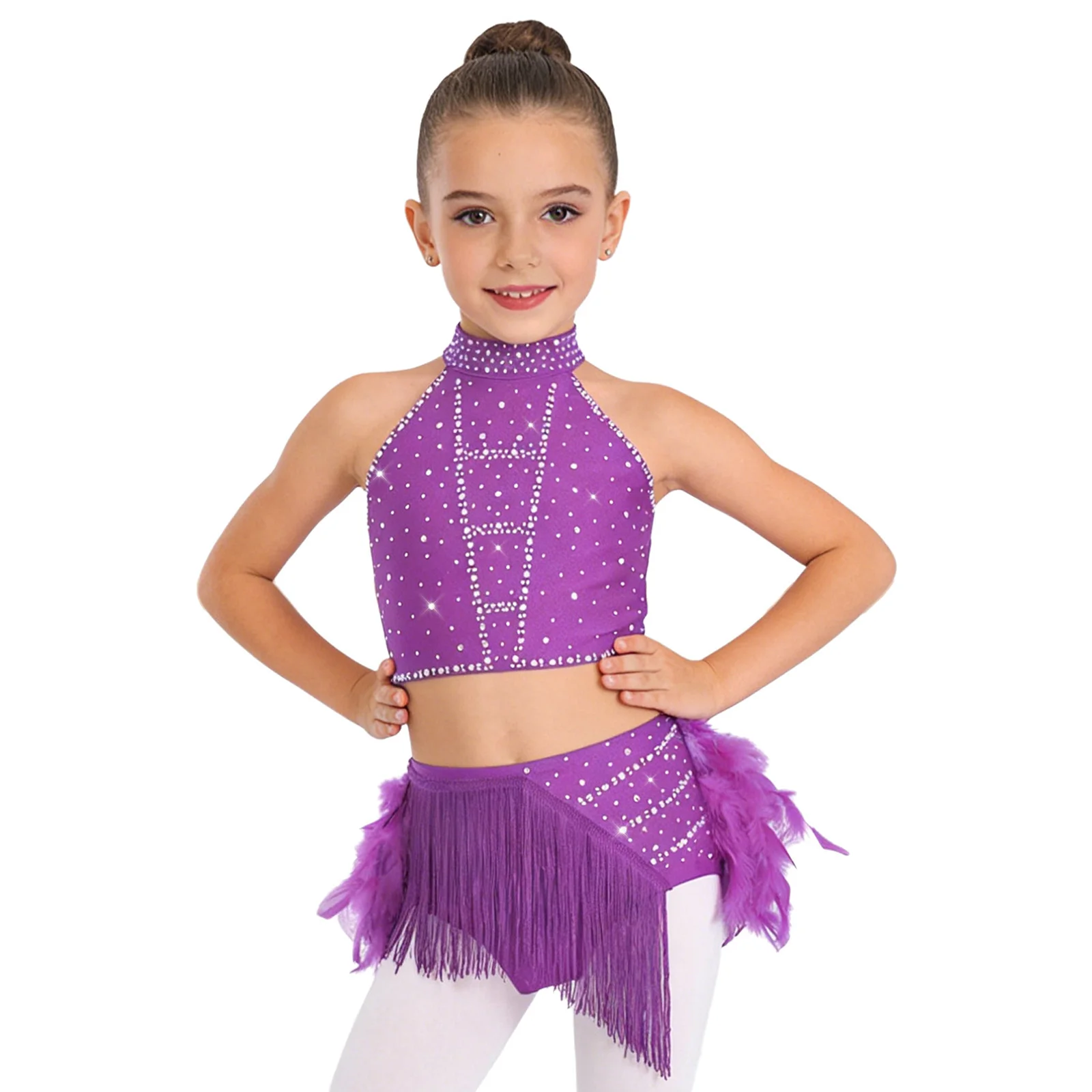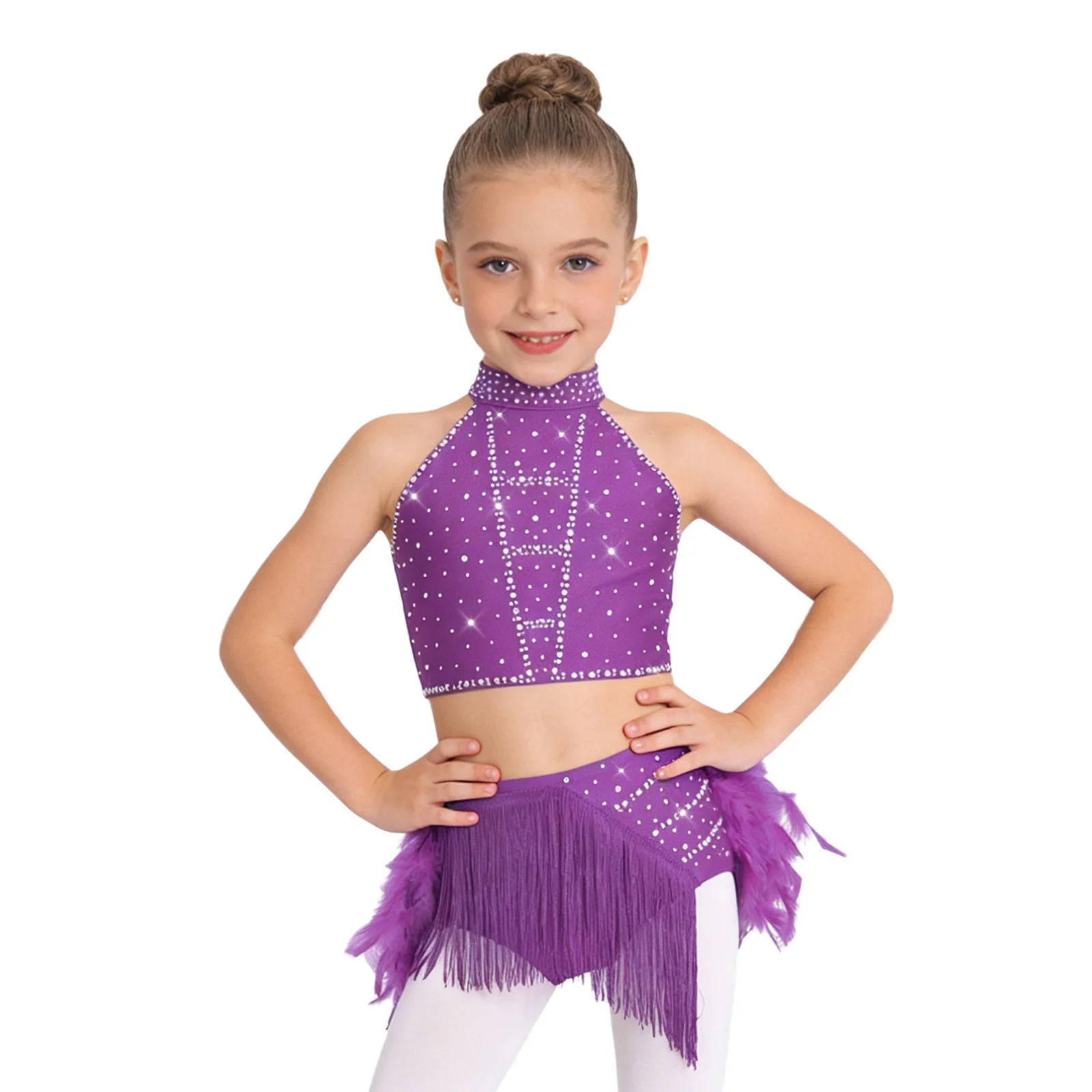 Kids Girls Ballet Samba Rumba Dance Outfits Latin Dance Performance Costume Crop Top with Tassels Feather Skirt Dance Wear - Royal Blue / 6