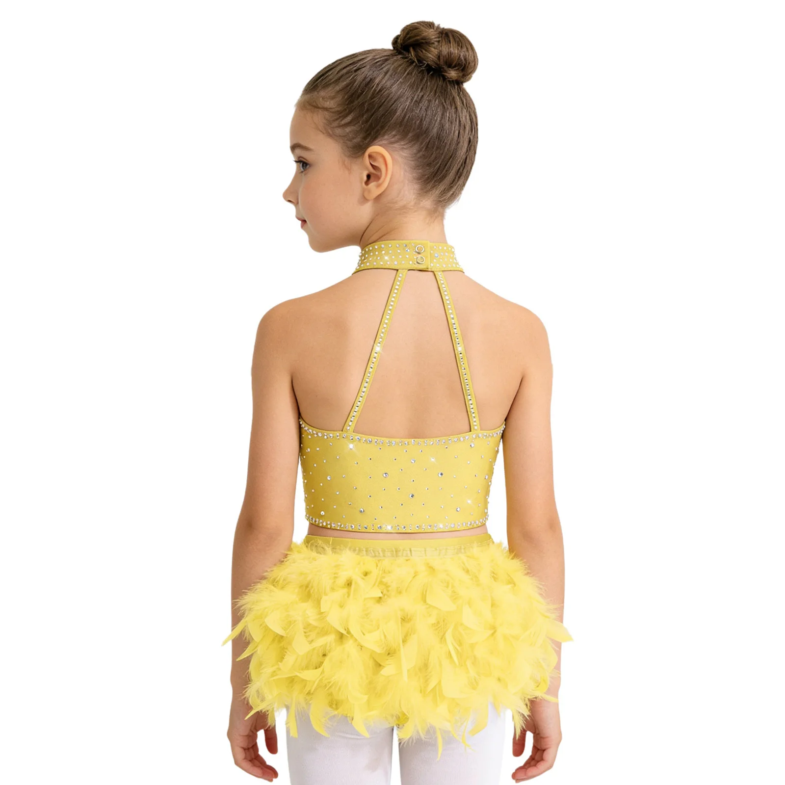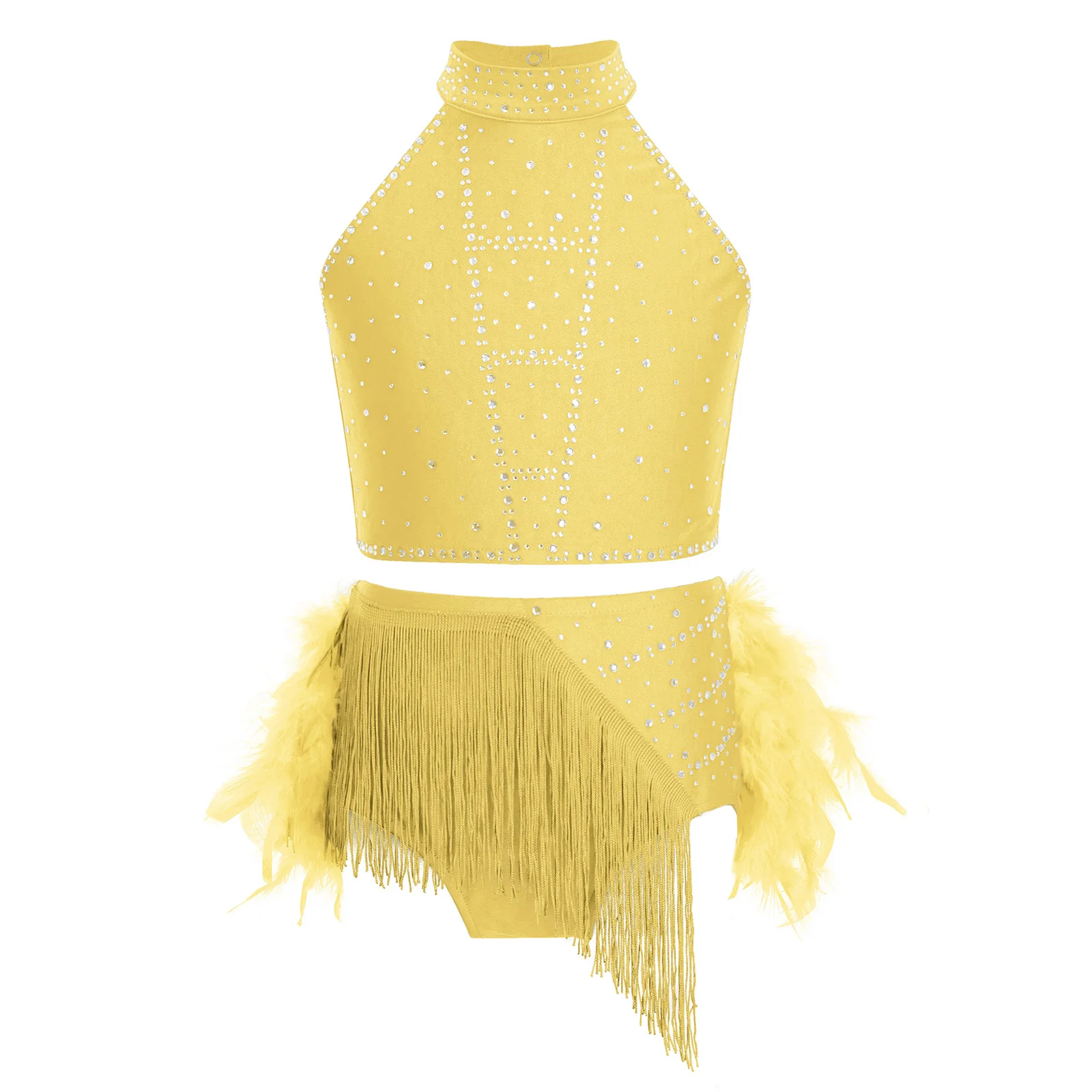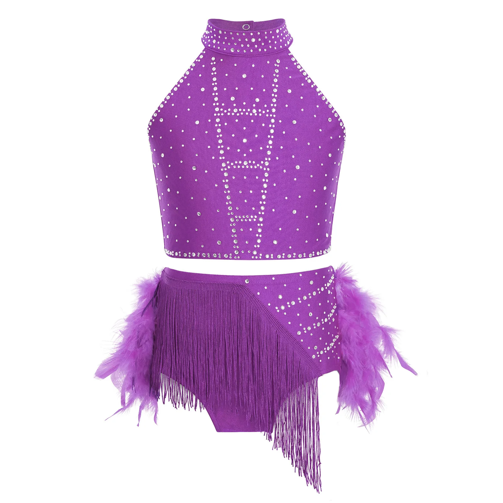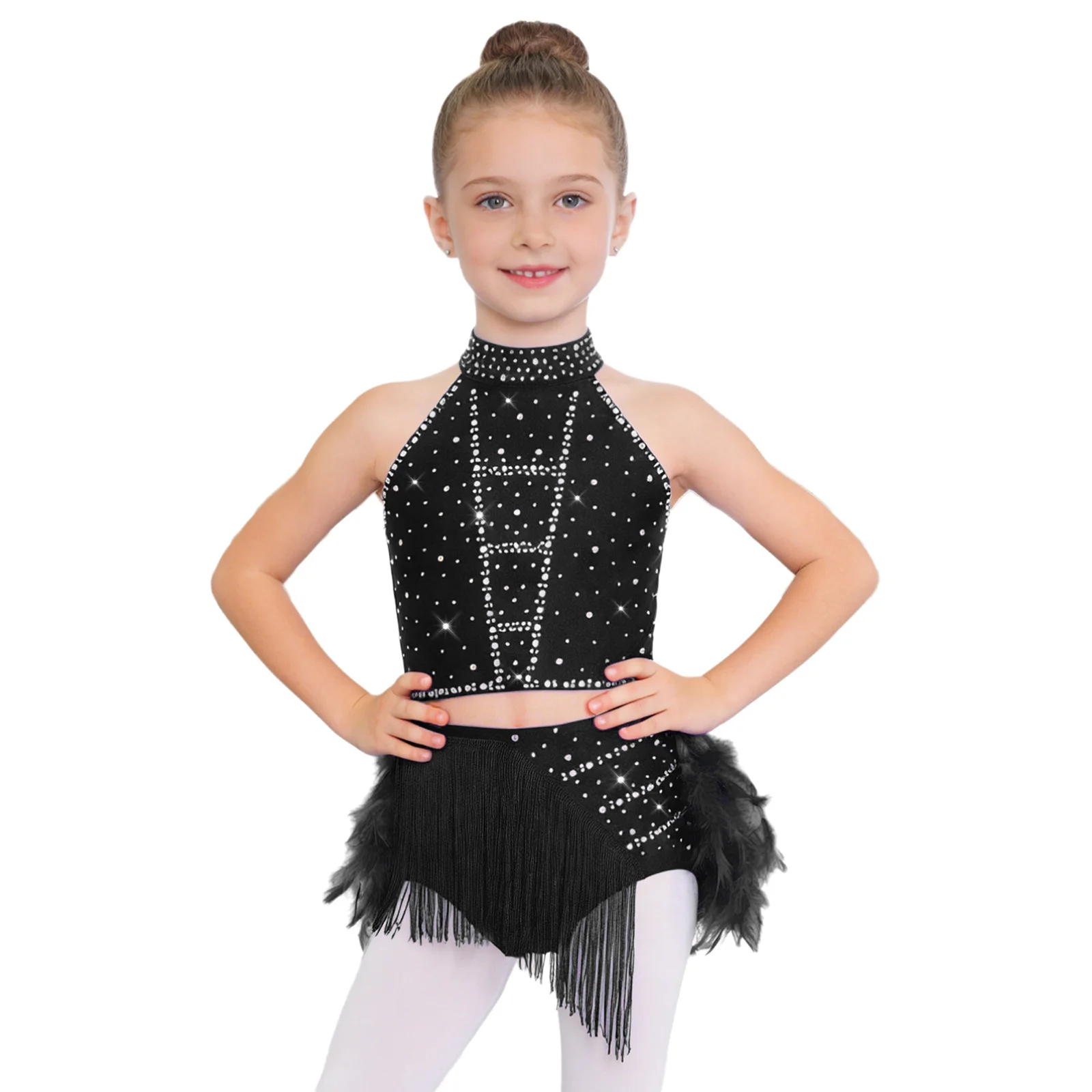 Kids Girls Ballet Samba Rumba Dance Outfits Latin Dance Performance Costume Crop Top with Tassels Feather Skirt Dance Wear - Royal Blue / 6