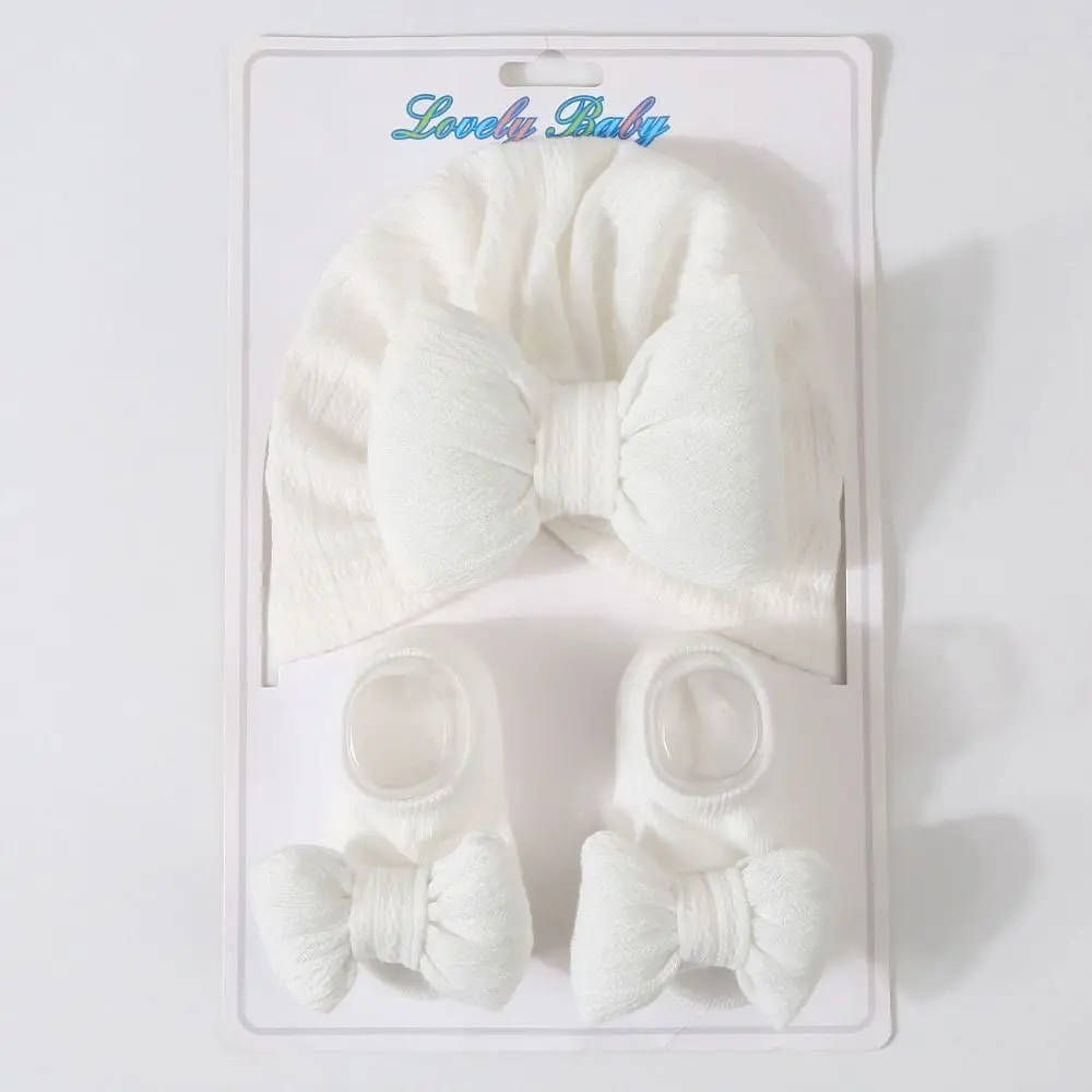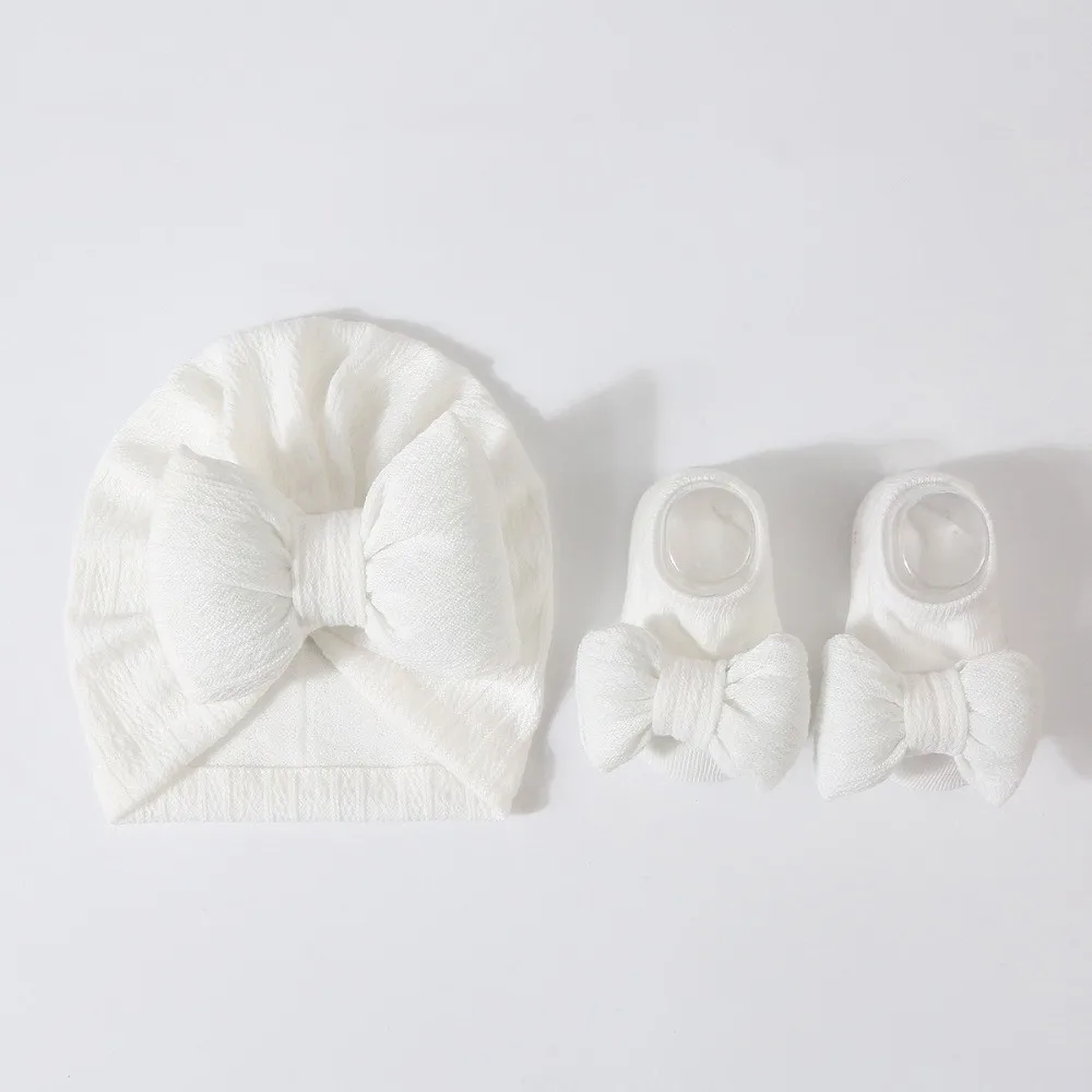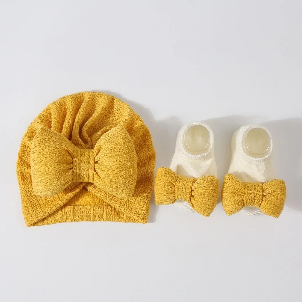 3Pcs/Set Soft Bow Baby Hat Socks Set Cotton Solid Color Baby Fetal Cap 0-12 Months Windproof Newborn Turban Hat Toddler - Khaki