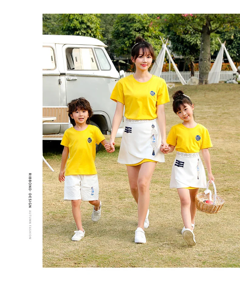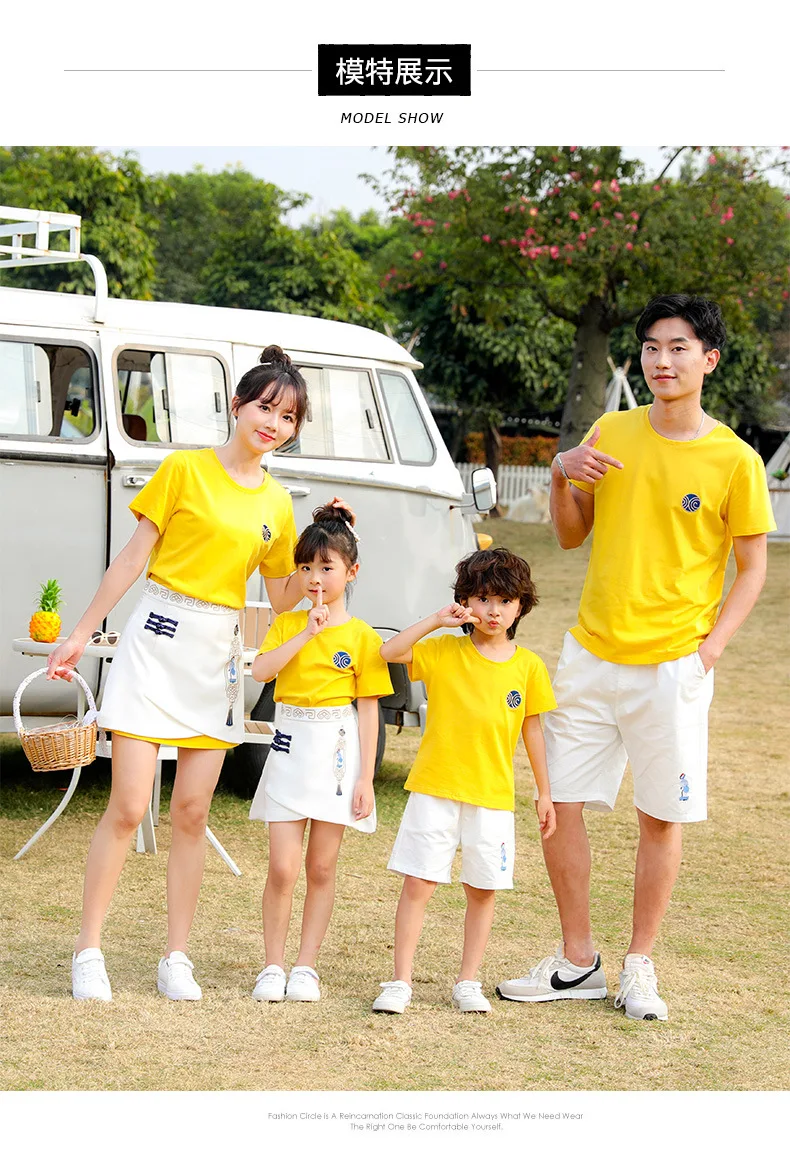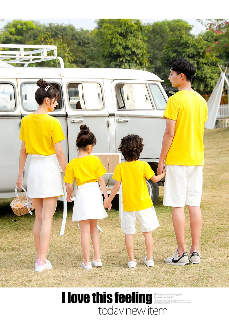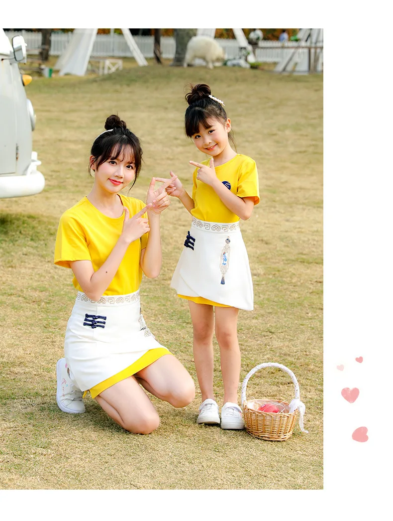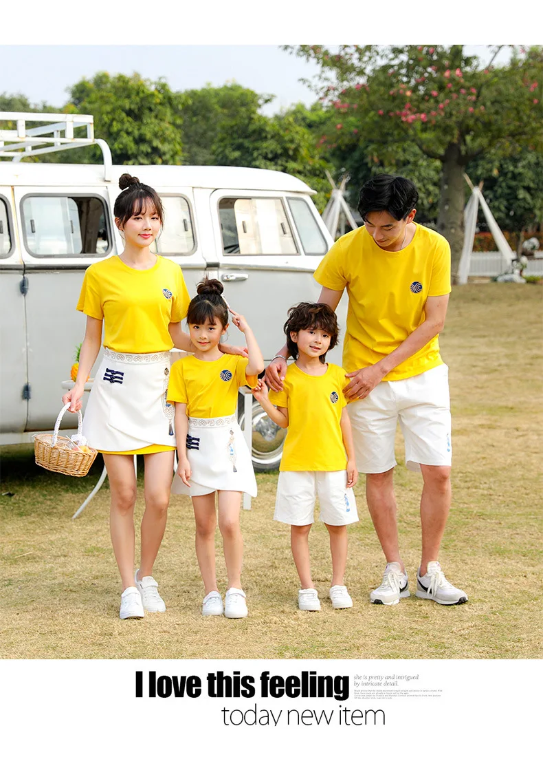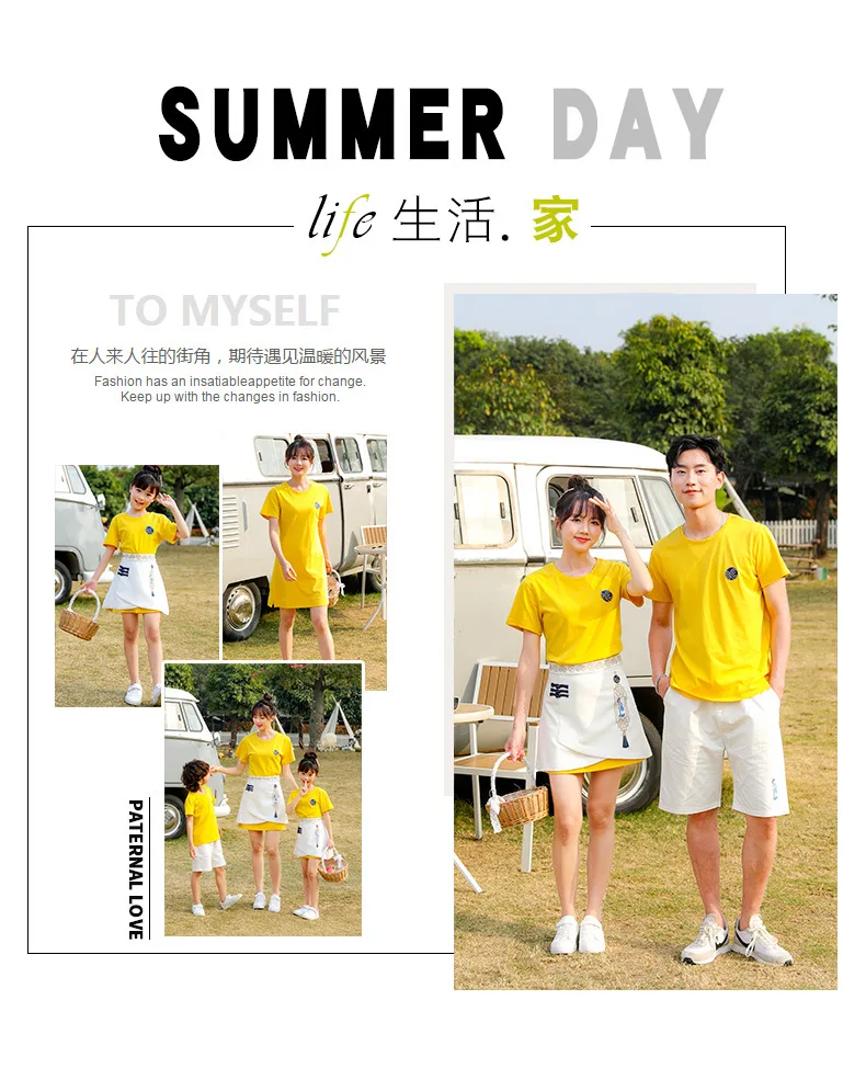 Family Matching Summer Clothes Sets Mom Daughter Skirt and Long T Shirt 2 Pieces Suit Dad Son Tops and Shorts Two Piece Outfits - Yellow / girls sets-3T