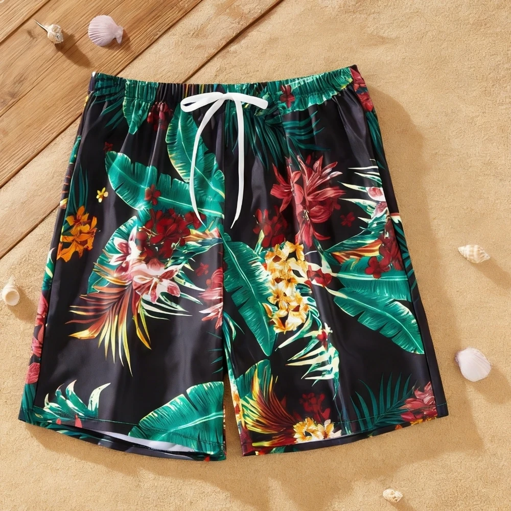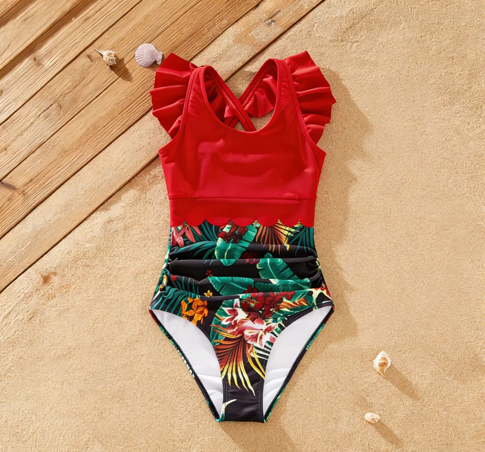 Family Matching Tropical Floral Print Swimwear Set: Dad Shorts, Mom One-Piece, Kid Swimsuit - Red / Girl 2Y
