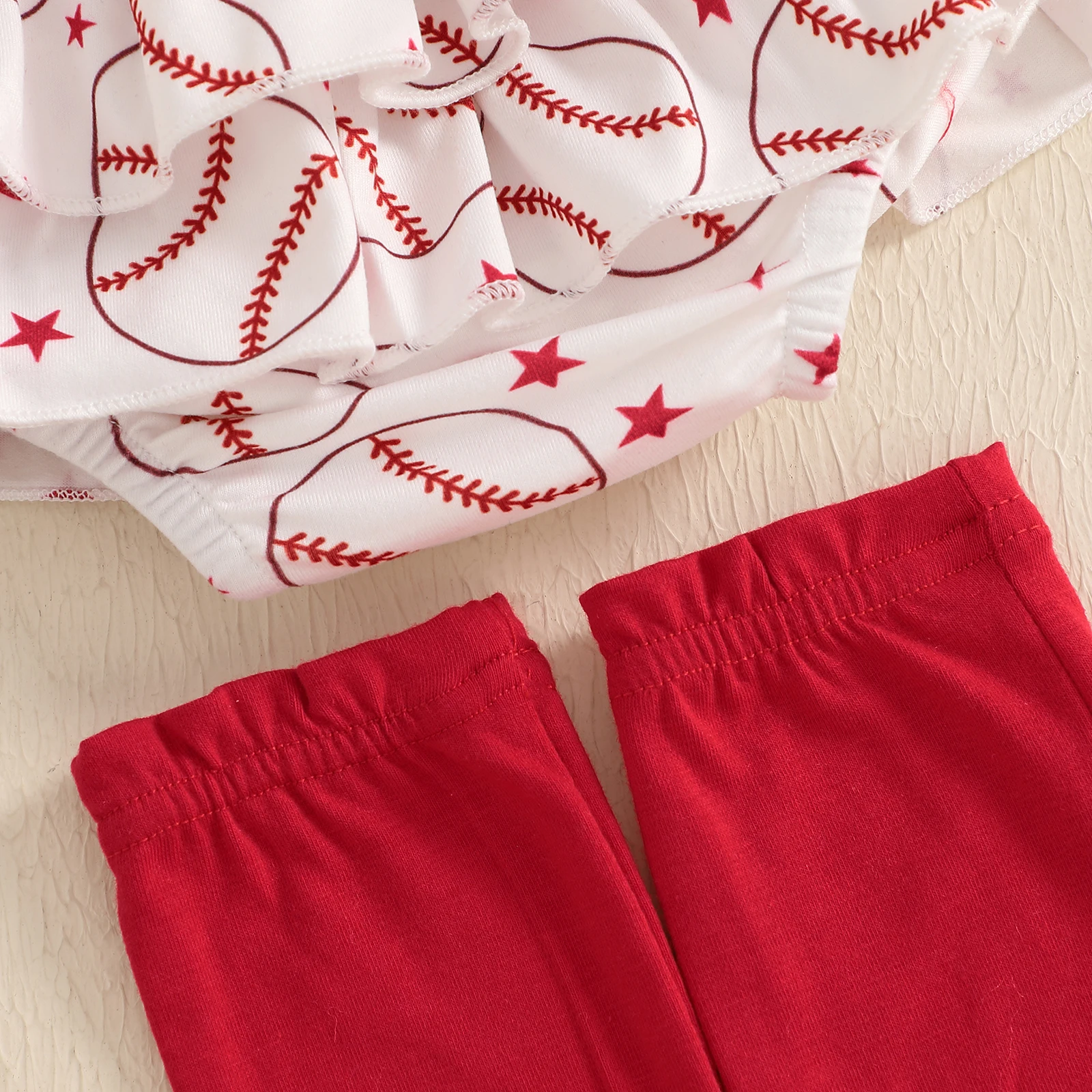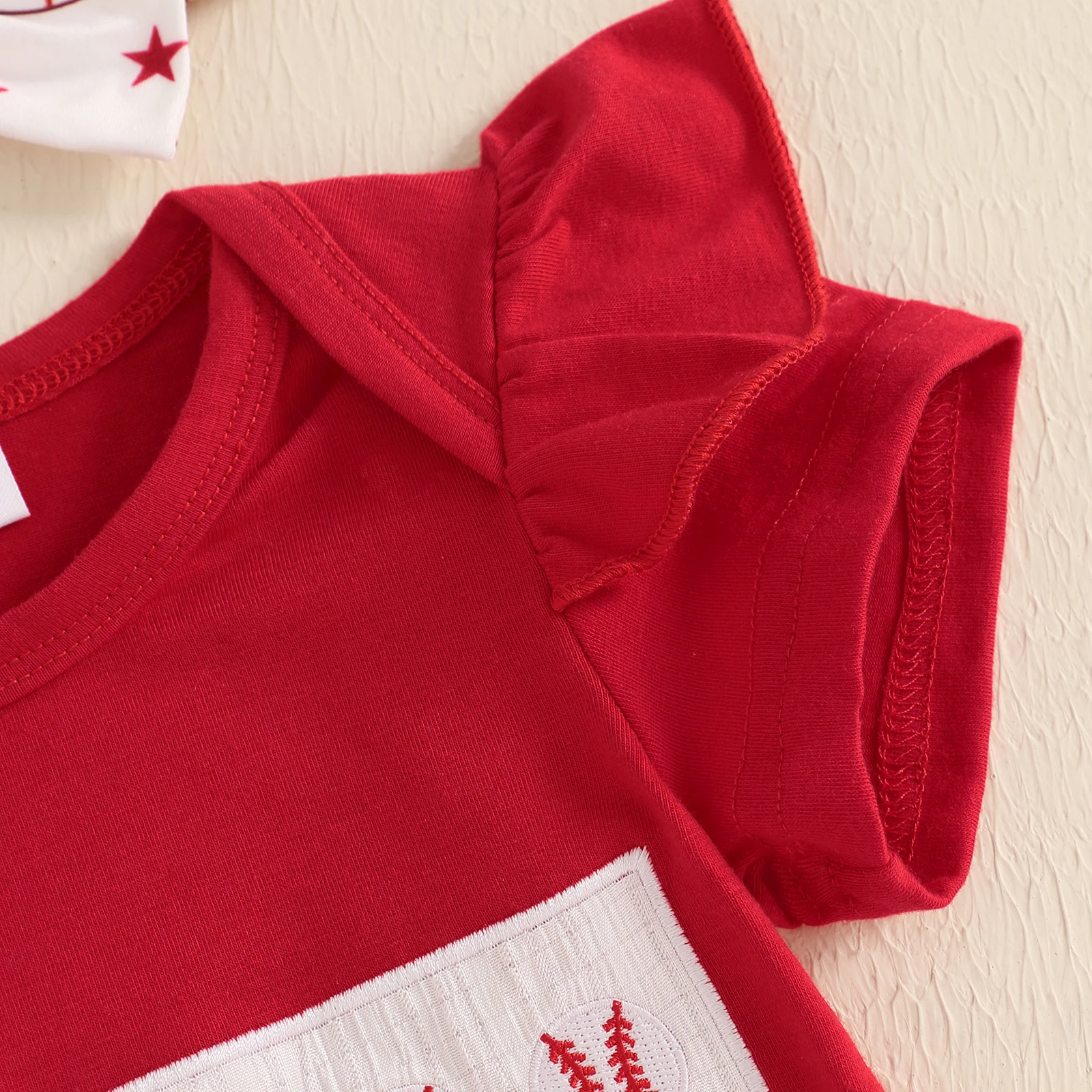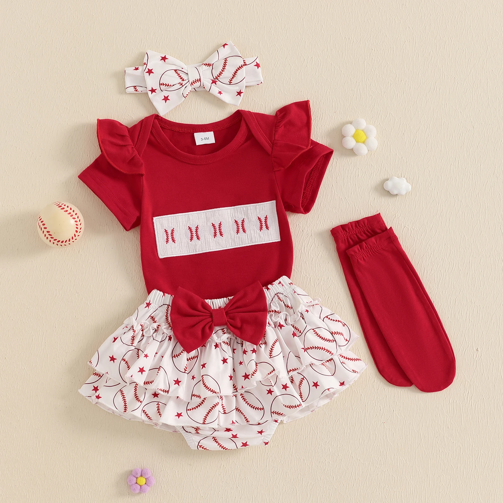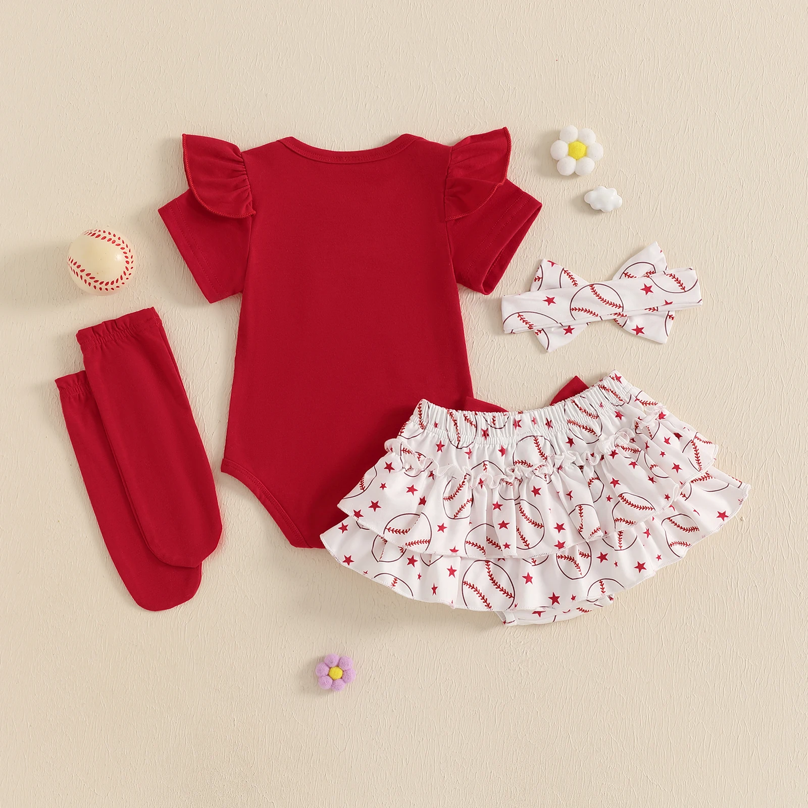BeQeuewll New Sweet Baby Girl Summer Clothes 4PCS Newborn Outfit Star Baseball Short Sleeve Romper Skirt Socks Headband Kid Suit - Red / 3-6 Months